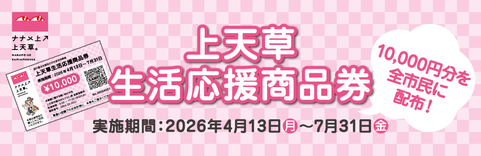 - 上天草市民1人につき10,000円分の商品券が1枚配布されます。
