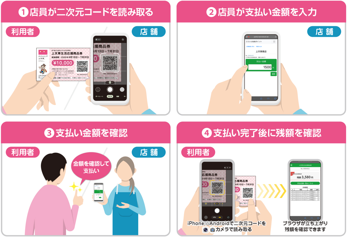 商品券の利用方法、残額の確認方法のマニュアルを掲載しております。